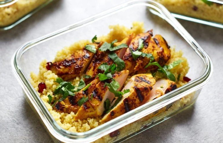 6) Finally, divide your couscous into 4 containers, top with two pieces of marinated chicken and finish with a sprinkle of coriander.